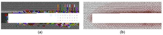 The model consists of individual blocks, each with a side length of 0.3 m, resulting in a total of approximately 1.55 million three-dimensional elements. To achieve a gradual mesh transition from the center to the outer side, a gradual mesh refinement approach is applied from the roof and bottom towards the center. Fixed boundary conditions are imposed on the left and right, front and back sides, as well as the bottom of the model to restrict horizontal and vertical displacements. A vertical downward load is applied to the roof of the model to simulate the self-weight stress generated by the overlying rock layer. Varying the roof loads allows for simulating the stability of the excavation roof at different depths of the roadway.