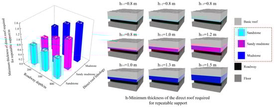 Based on the numerical simulation results presented in Table 4 for a roadway buried at a depth of 200 m, it is observed that in the presence of a sandstone direct roof, various thicknesses of the direct roof can meet the requirements for repeatability of roof support. When the direct roof consists of sandy mudstone, the range of direct roof fracturing is between 0.5–0.6 m, indicating the repeatability of the roadway roof for different roof thicknesses. However, with a mudstone direct roof, the range of direct roof fracturing increases to 0.8–1 m. Thus, it is determined that the roadway roof maintains repeatability when the direct roof thickness exceeds 1 m.