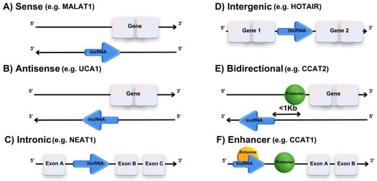 LncRNA is a type of noncoding RNA defined as a molecule longer than 200 nucleotides that does not encode proteins. The length of lncRNA is comparable to that of mRNA, although it contains fewer exons. The biogenesis of lncRNA occurs primarily in the cell nucleus, where it is transcribed by RNA polymerase II (Pol II) from genomic DNA. Once transcribed, lncRNAs undergo various post-transcriptional processing steps, including 5′ capping, splicing, and polyadenylation, similar to protein-coding mRNAs. Some lncRNAs exist in the cytoplasm, but they are not translated [13]. A classification of lncRNAs is shown in Figure 1.