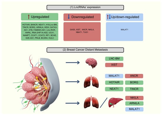 (1) Expression of potential lncRNA-based biomarkers for breast cancer and (2) their association with distant metastasis. Image created with Canva Pro, https://www.canva.com/pro/ (accessed on 25 July 2024).
