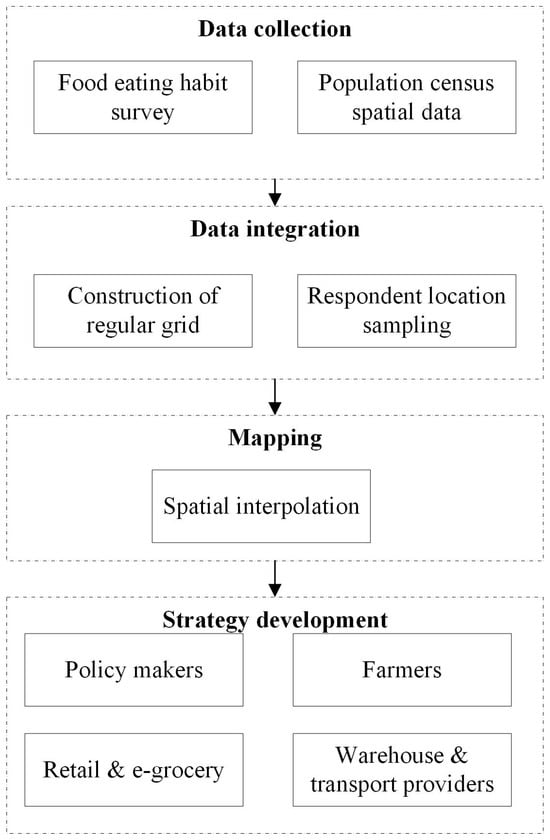 Understanding the dynamics of food demand is essential for addressing global challenges related to nutrition, health, and sustainability. As urban areas grow and populations increase, the demand for food intensifies, leading to significant challenges in ensuring food accessibility and equity. According to the United Nations, approximately 56% of the world’s population lived in urban areas in 2021, and this number is projected to rise to nearly 70% by 2050 [1,2]. Additionally, the global population is expected to reach 9.7 billion by 2050, further increasing the demand for food [3]. This intensifying demand requires targeted strategies to promote equitable access to nutritious food options, as urbanization continues to accelerate and populations expand. This situation is compounded by supply chain issues and economic imbalances, which contribute to the emergence of food deserts. Analyzing food demand patterns is crucial for crafting effective policies and interventions. This analysis informs agricultural production and supply chain management, and highlights the nutritional needs of diverse populations. Moreover, it sheds light on the environmental impact of food production, guiding efforts towards more sustainable practices. By exploring the factors that influence food demand, researchers and policymakers can better predict future needs, ensuring food security and promoting healthier eating habits across communities. The study by Liddy et al. (2023) discusses the limitations and opportunities in food mapping approaches, particularly in rapidly growing urban regions. It emphasizes the need for comprehensive frameworks that can capture the dynamic and multifaceted nature of food systems [4]. This aligns with the novelty of our work, which aims to provide a more granular and flexible spatial mapping of food demand.