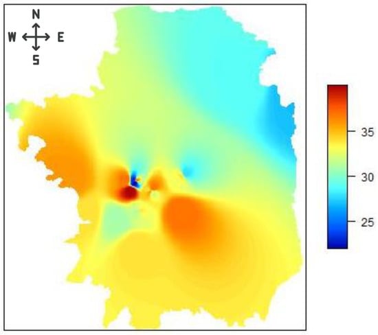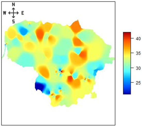 Utilizing the Shepard interpolation method, the primary outcomes are presented in Table 1. Analysis of the mean and median values reveals that the predictive outcomes are in consistent agreement with the sample of measured data points, evidencing a notable accuracy level. In the context of Lithuania as a whole, the observed data yielded a mean of 32.84 and a median of 33.00. The predictive outcomes demonstrated a mean of 33.02 and a median of 32.88, indicating minimal discrepancies. Within the specific locale of Vilnius county, the observed measurements indicated a mean of 33.02 and a median of 32.88, while the predictive results showed a slightly lower mean of 32.75 and a median of 32.66. These differences are slight. Moreover, the interpolation method successfully identified the minimum and maximum values for both the expansive territory of Lithuania and the considerably smaller region of Vilnius county. This accuracy in capturing the extremities of the data further validates the efficacy of the Shepard interpolation method in producing reliable predictive insights. Based on the map provided in the image of Figure 2 we can discern the spatial distribution of eating habit scores across the geography of Lithuania. The color spectrum on the right indicates the total score, with lower scores in blue signifying poorer eating habits and higher scores in red to orange representing healthier eating habits (Figure 2).
