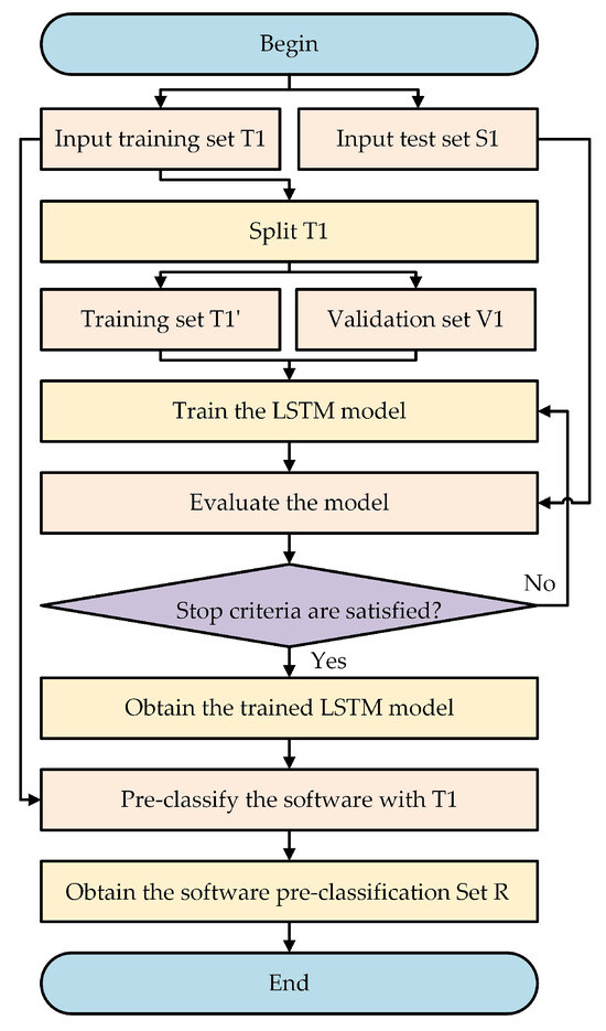 - Obtain the software pre-classification set R: Input the training set T1 into the trained LSTM model to obtain the pre-classification results of T1 and form the set R.
