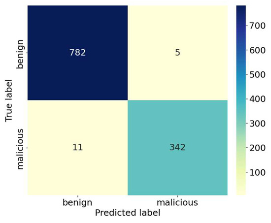- Accuracy [14]: Accuracy represents the proportion of accurately predicted samples to all samples. It is a simple and intuitive metric to evaluate the ability of a model to correctly classify examples. As shown in Equation (8):In the formula, (Negatives) represents the malware label, while (Positives) stands for benign software. represents the software with true and predicted ; represents the software with true and predicted ; represents the software with true and predicted ; and represents the software with true and predicted .