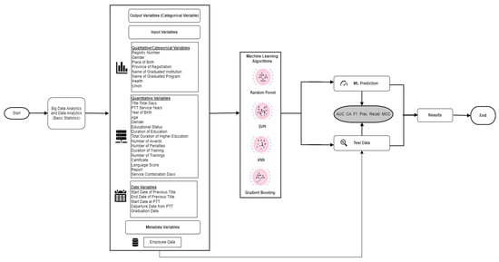 In the model approach developed for this study, raw data were described using basic statistics after data extraction and analytics studies. The prepared datasets were then analyzed and evaluated using ML algorithms. This study utilized 29 input variables, categorizing the main inputs into qualitative, quantitative, and historical categories. The output variable of this study is a categorical variable used to determine employee titles. The methodology’s flow and parameter characteristics are visualized in Figure 1.