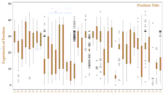 The box plot obtained by taking into account years of service by title is illustrated in Figure 4. An outlier is a large or small observation in a dataset that is outside of the normality. Especially in statistical analyses, outliers, which are effective in highlighting the emergence of a disproportionate effect, cause misleading results (or interpretations). In general, discrete values that negatively or misleadingly affect the results of statistical analysis are excluded from the scope of the analysis, but in this study, they are included in the scope of the analysis in order to avoid bias features. The titles with the most outlier value points are K7 (Security Officer) and G3 (Office Worker), followed by B12 (Computer Operator), B4 (Provincial Director), D1 (Deliverer), D5 (Typist), K4 (Controller), M3 (Official (No.3)), M6 (Manager), P2 (Postman), P4 (Programmer), T5 (Technical Manager), T9 (Technicist), U3 (Assistant Specialist), V3 (Data Preparation and Control Operator), and V4 (Treasurer).