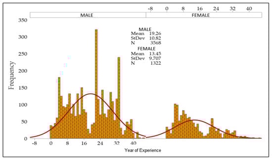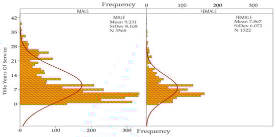 When the gender data of the staff employed in the PTT are analyzed according to years of experience, it is observed that 73% of the 4890 employees are male and 27% are female. When the years of service of PTT employees are analyzed according to their gender, it is seen that 3568 male employees have worked in a position for an average of 19.26 years and 1322 female employees have worked in a position for an average of 13.45 years. These results are considered to be related to the high number of operational-level employees (standard deviation of 10.82 for males and 9.71 for females). The visualization of the frequency graph of male and female employees by title according to the normal distribution curve is presented in Figure 5.