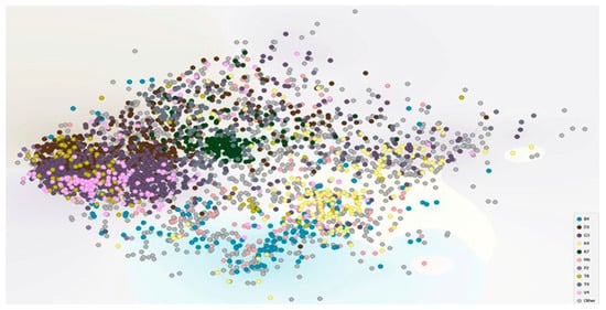 The breadth of the color scale indicates that there are many different title categories in the dataset, and these categories are highly diverse. This demonstrates that the HR data are comprehensive and varied, reflecting employees’ different skill sets and job roles. The density of points in certain areas of the graph indicates the data density and the number of employees in those areas. For example, the dense points representing the P8 and PB categories in the center of the graph suggest that the number of employees in these categories is higher compared to others. Such visualizations provide a practical example of how big data analytics can be utilized in human resource management, contributing to more data-driven and effective HR strategies [,]. Understanding how employees are distributed according to titles and which title groups share similar characteristics provides critical information for talent management, training and development programs, and workforce planning.