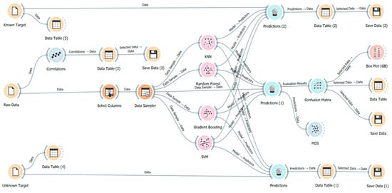 The ML algorithms in this study were implemented in the Orange 3.35 Machine Learning computer program to obtain the forecast data. This program uses python software infrastructure. It is open-source (free of charge) and is compatible with all computer operating systems. This program offers a large, diverse toolbox that allows for the visual creation of data analysis workflows. A structure has been designed in the created ML model to evaluate the known and unknown states of the raw data output variable. The input and output variables have been defined in the “select columns” module, and the training and test ratios have been selected in the “data sampler” module. In this study, 75% of the data were used for training and 25% for testing. Algorithms that produced meaningful results for this study were selected from the Orange program and added to the model. The model results were evaluated by comparing the prediction and test data. The “MDS” table created for the model is also presented in this study. A screenshot of the workflow of the ML model designed through the Orange program for this study is presented in Figure 8.