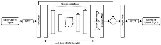 Deep Complex UNET architecture combines the advantages of deep complex networks [22] and UNET models, basically known as a convolutional autoencoder with skip connections [23]. DCUNET has been optimized to perform complex domain operations more efficiently and effectively [24]. The convolutional layers in the UNET architecture were replaced with complex convolutional layers, initialized according to Glorot initialization [25]. Additionally, complex-batch normalization was applied to every convolutional layer, excluding the last layer in the network. Each encoder of the network was composed of stridden complex convolutional layers, and the decoder was made of strided complex deconvolutional operations in order to restore the input size. To prevent the loss of spatial information, max-pooling operations were not used. For both the encoder and decoder, Leaky ReLU was the activation function. Figure 2 resumes the functioning of DCUNET.