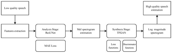 VoiceFixer (VF) is a proposed system [21] that aims to mimic speech analysis and comprehension of the human auditory system. VF uses advanced algorithms to simultaneously eliminate noise, distortions, and other issues in speech signals. Additionally, it can improve speech’s intelligibility and clarity by enhancing the signal’s spectral and temporal features. This restoration system consists of an analysis stage and a synthesis stage. The analysis stage was modeled by a ResUNet model (Mel spectrograms were utilized during this stage), and neural vocoder, which is a generative adversarial network (GAN) that operates in both time and frequency domains (TFGAN), was used to model the synthesis stage. VoiceFixer generalizes well to severely degraded real speech recordings. Figure 4 presents an overview of its architecture. VF was trained (as described in another paper [21]) on two speech databases (CSTR VCTK corpus and AISHELL-3) and two noise databases (VCTK-Demand and TUT).