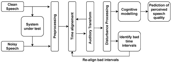 The Perceptual Evaluation of Speech Quality (PESQ) is an objective method for assessing the quality of speech as received by a listener [28]. It evaluates speech quality by calculating the total loudness difference between the processed and clean signals [29]. The PESQ score fluctuates in the range of −0.5 to 4.5 [12]. Figure 5 presents a schema of the structure of PESQ.