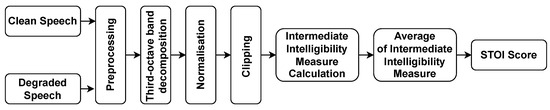 The Short-Time Objective Intelligibility (STOI) metric is used to predict the intelligibility of the processed speech through enhancement or separation algorithms. STOI operates on short-time segments of the speech signal, typically around 400 milliseconds, and provides a score correlating with the intelligibility of the processed speech as perceived by human listeners [30]. Improved speech intelligibility is indicated by a higher STOI rating [12]. Figure 6 presents the structure of STOI.