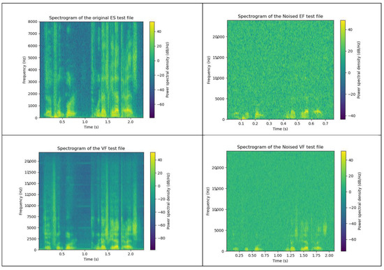 Figure 7 shows the spectrograms of the original ES and VF wave files and their corresponding white noise wave files.