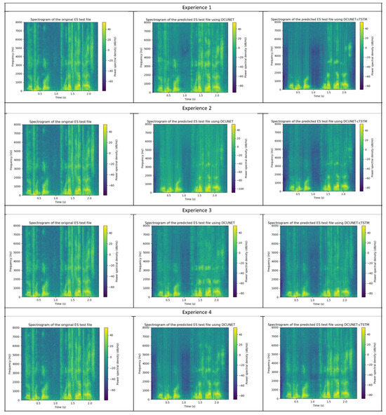 Spectrograms of the ES test file using the pre-trained models of the four experiments.