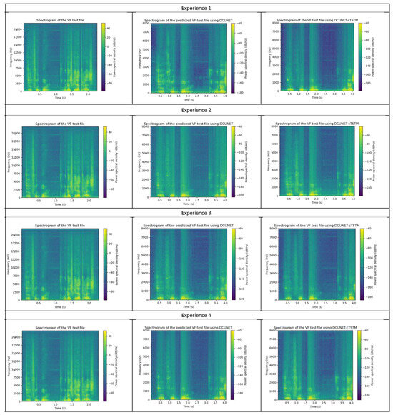 Spectrograms of the VF test file using pre-trained models of the four experiments.