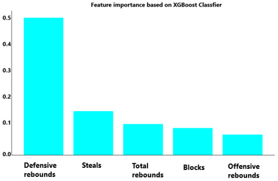 The XGBoost algorithm estimated the most crucial defensive variable influencing game wins in the NBA league. The results obtained with the XGBoost algorithm were consistent with the hypothesis tests, revealing that defensive rebounding is the most significant defensive factor impacting game wins, with an accuracy rate of 86%. Detailed information about the defensive variables affecting the game win is presented in Figure 2.