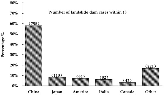 Landslide dams are a natural deposition formed by unstable geological bodies such as landslides and debris flow that block rivers and streams [1,2,3,4,5]. These dams are characterized by high permeability, strong heterogeneity, and a wide range of gradations [6]. Figure 1, created by the authors using data from reference [7], shows the global distribution of landslide dams, with China having 758 landslide dams, accounting for 59% of the global total. Sichuan Province is a high-incidence area for landslide dams in China, with two notable events occurring in Die Xi Town, Mao County, Sichuan, in 1933 and 2017 [8,9]. The Wenchuan earthquake in 2008 triggered extensive landslides, resulting in the formation of 256 landslide dams [10]. From October to November 2018, the Jinsha River at the Sichuan–Tibet border experienced two consecutive landslide damming events within a month [11].