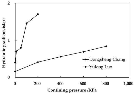 In the equation, P represents the confining pressure applied to the soil sample. Although different scholars have fitted various forms of the relationship curve between the confining pressure and critical hydraulic gradient [25,64], the starting hydraulic gradient of the soil increases with the increase in the confining pressure, as shown in Figure 2.