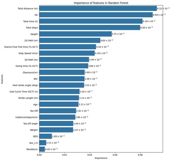 We chose the Random Forest regression algorithm due to its strengths in handling complex, nonlinear relationships and its robustness against overfitting, which was particularly important given the variety of gait and frailty variables in our study. Additionally, Random Forest helps us gauge the importance of each variable, which is crucial for interpreting our results. Prior to this, we used principal component analysis (PCA) and factor analysis to reduce dimensionality and uncover the data structure, finding that the first two principal components explained a significant amount of variance. We also applied multinomial logistic regression, which identified significant variables but showed lower accuracy compared to Random Forest. The Random Forest model’s superior performance in classification accuracy and its ability to manage intricate interactions made it the most appropriate choice.