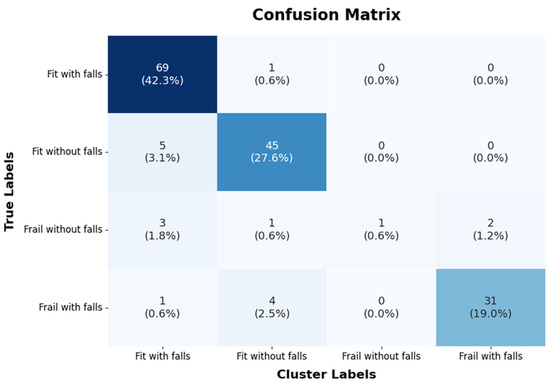 The results of the Random Forest model’s confusion matrix are shown in Figure 3 and the metrics’ performance in Table 2. We found high accuracy in classifying participants in the four categories of frailty and falls.