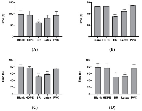 PTT in animal plasma such as rabbit, porcine, and monkey. The PTT measured with the plasma reacted with the materials. (A) Plasma obtained from rabbits, (B) plasma obtained from porcine, (C) plasma obtained from Rhesus macaque, and (D) plasma obtained from Cynomolgus macaque. * Statistical significance (* p < 0.05; *** p < 0.0005; **** p < 0.0001, one-way ANOVA) compared with the blank control.