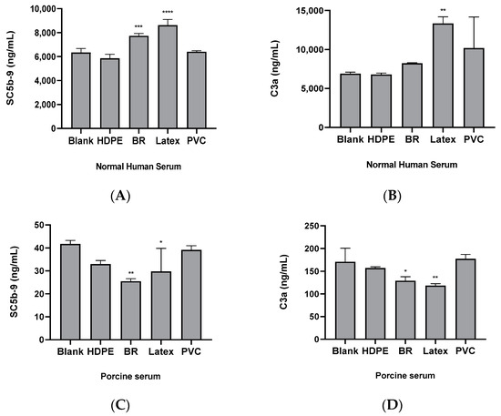 In human serum, HDPE serves as a hemocompatibility negative control, and commercially available PVC for medical use did not show significant changes in complement system activity compared with the blank test group. In contrast, significant increases in complement system activity were observed in the positive control candidates of the black rubber and latex test groups, except for some test groups (black rubber, C3a) (Figure 3A,B). In contrast to the results of complement system activity in human serum, the substances in porcine serum showed no significant increase in complement system activity compared with the blank test group (Figure 3C,D).