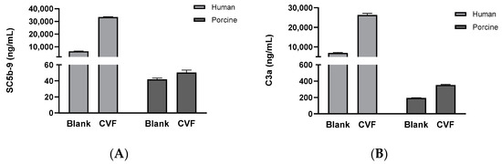 To compare the levels of complement system activity of human and porcine sera, CVF, which is a strong complement system activator, was reacted with human and porcine sera, and the degree of complement system activity in each serum was observed. When porcine serum was reacted with CVF, SC5b-9 and C3a exhibited basal levels (50–354 ng/mL), whereas high levels of SC5b-9 and C3a (26,296–33,390 ng/mL) were observed in the case of human serum (Figure 4A,B).