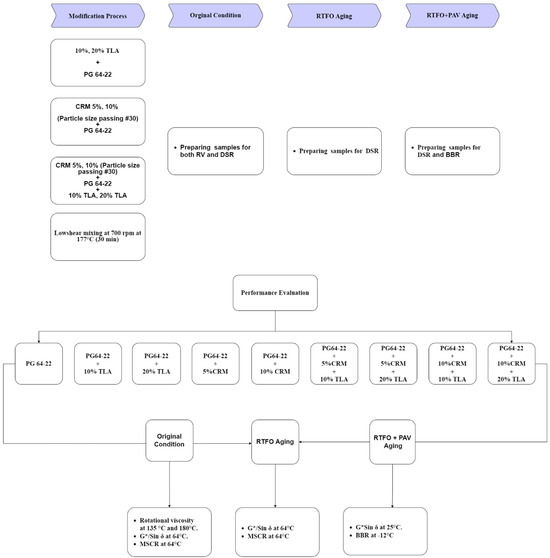 For this study, we employ the wet process, specifically McDonald Technology, which has been identified as the most successful method for achieving homogeneous blending [19]. To evaluate the performance of the produced binder, we use the Superpave test method along with the Multiple Stress Creep Recovery (MSCR) test. The experimental method is illustrated in Figure 1.