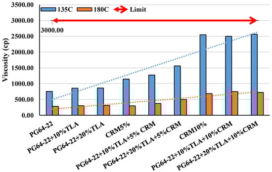 - The addition of TLA greatly increases the viscosity of the PG 64-22 binder. The viscosity shows a noticeable rise at 10% TLA and remains constant at higher concentrations. The addition of CRM enhances viscosity, resulting in a significant increase when 10% CRM is used. This increase in viscosity improves the material’s ability to resist deformation and cracking.