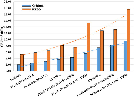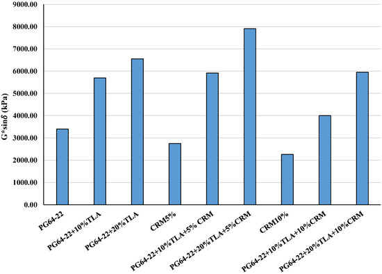 G*sinδ at 25 °C of the modified binders at RTFO + PAV aged conditions.