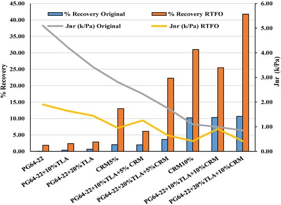 Percentage recovery and Jnr at 64 °C of the modified asphalt binders at original and RTFO conditions.