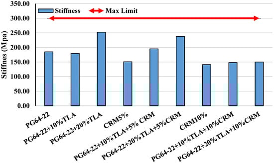 Stiffness at −12 °C of the modified asphalt binders after RTFO + PAV aged condition.