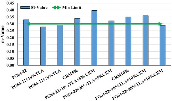 Analyzing the m-value characteristics of different asphalt binder blends at a temperature of −12 °C, as depicted in Figure 7, offers an additional understanding of the stress relaxation qualities of asphalt binders under low-temperature conditions. Higher values of m often indicate greater resistance to thermal cracking. The virgin binder exhibits an m-value that slightly exceeds the minimum threshold, indicating its commendable performance at low temperatures. When 10% TLA is introduced into PG 64-22, the m-value decreases below the minimal threshold. This tendency persists with a 20% TLA, demonstrating even lower m-values. TLA has a tendency to enhance the rigidity of the binder, thereby diminishing its capacity to alleviate stress at low temperatures.