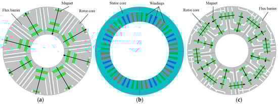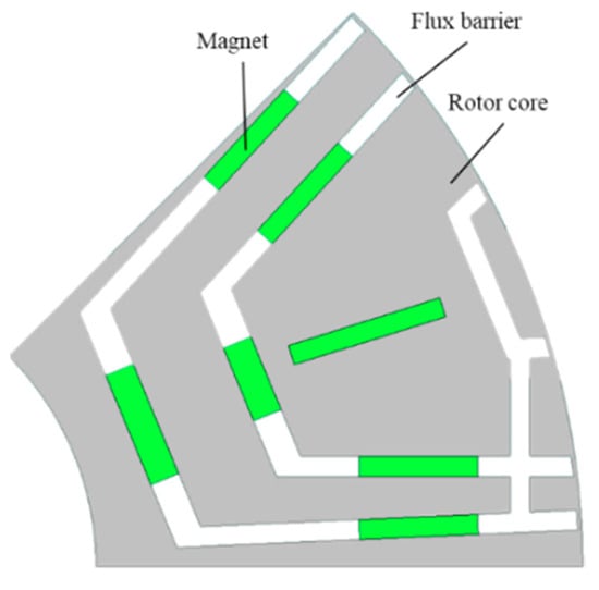 Recently, due to the increasing consumption of rare earth resources, the prices of various raw materials such as rare earths have been increasing [,]. Since rare earth is a non-renewable resource, in order to reduce the dependence on rare earth resources, permanent-magnet-assisted synchronous reluctance motors (PMA-SynRMs) are gradually entering into the public’s view []. The PMA-SynRM combines the advantages of permanent magnet synchronous motors (PMSMs) and synchronous reluctance motors, characterized by high output torque, high power density, high efficiency, and good speed regulation performance [,]. A multilayer flux barrier structure is generally applied in the PMA-SynRMs to maximize the utilization of their reluctance torque [,]. Only a small amount of permanent magnets remains in the flux barrier structure of the PMA-SynRM to assist the excitation [,], which provides permanent magnet torque for the PMA-SynRM. The PMA-SynRM typically utilizes fewer permanent magnet compared to PMSM for the same volume of PMA-SynRM [,]. Therefore, the cheaper price and better performance give the PMA-SynRM a wide range of applications in the field of variable speed drives for electric vehicles, water pump compressors, household appliances, medical devices, etc. [,,,,,].
