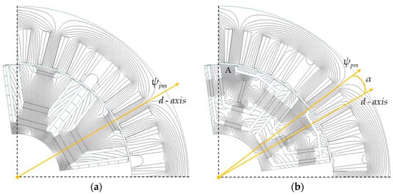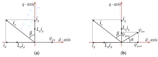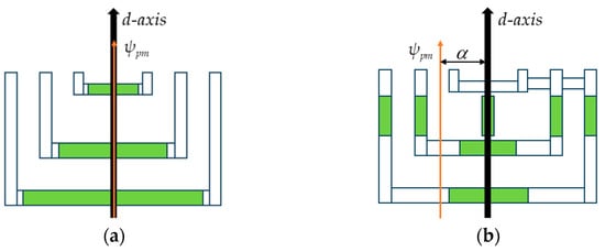 In order to study the MAS effect of the proposed model, a simplified analytical model of the conventional and proposed models neglecting core saturation and cross-coupling is developed based on the single-pole planar expansion of the rotor shown in Figure 2. From Figure 2b, it can be seen that the permanent magnet flux linkage ψpm of the proposed model has been shifted, and ψpm forms an angle α with the d-axis. The simplified vector diagram built from Figure 2 is shown in Figure 3.