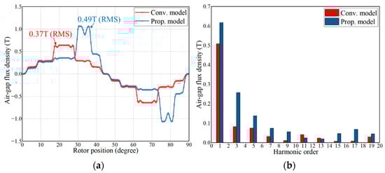 Comparison of no-load air-gap flux density for the two models. (a) Air-gap flux density waveform. (b) Harmonic decomposition of the air-gap flux density.