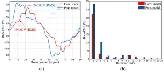 Figure 5 demonstrates the comparison of the no-load air-gap flux density between the conventional model and the proposed model. According to Figure 5a, it can be seen that the air-gap flux density magnitude of the proposed model is higher than those of the conventional model, and its air-gap flux density RMS is improved by 32.43% compared with the conventional model. Based on the air-gap flux density waveforms, it can be seen that the proposed model produces a certain offset angle compared to the conventional model. According to Figure 5b, due to the asymmetric structure of the proposed model, the higher harmonics in the harmonic decomposition of the air-gap flux density are larger compared to the conventional model, and there are obvious distortions. The no-load back-EMF waveforms and harmonic decomposition of the two models are shown in Figure 6. Consistent with the air-gap flux density waveforms, the magnitude of the back-EMF waveforms of the proposed model is higher compared to the conventional model, and there is a certain offset. From Figure 6b, it can be seen that the high harmonics of the back EMF of the proposed model are still larger than those of the conventional model, and distortions also appear.