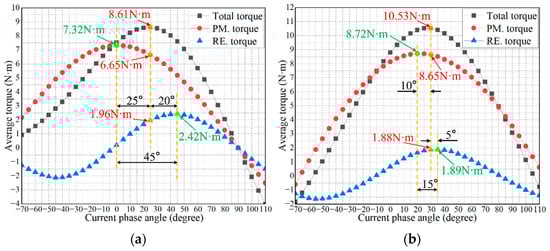 The torque of the PMA-SynRM consists mainly of permanent magnet torque and reluctance torque. In order to verify the torque characteristics of the proposed model after the MAS effect, the torque of the two models is decomposed using the frozen permeability method. The torque distribution of the two models at different current phase angles for a current RMS value of 2A is shown in Figure 7. It should be noted that in Figure 7, the orange markers are the components of the permanent magnet torque and the reluctance torque at the maximum total torque, and the green markers represent the components of the permanent magnet torque and the reluctance torque at the maximum total torque. The maximum total torque of the proposed model is improved by 22.3% compared to the conventional model. As seen in Figure 7a, the components of the maximum permanent magnet torque and the maximum reluctance torque of the conventional model have a phase difference of 45 degrees. In Figure 7b, the components of the maximum permanent magnet torque and the maximum reluctance torque of the proposed model display only 15 degrees of phase difference. Permanent magnet torque and reluctance torque utilization can be expressed by Equation (7).