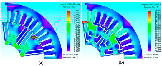 From Table 2, it can be seen that the utilization of both permanent magnet torque and reluctance torque is higher in the proposed model compared to the conventional model. This proves that the proposed model with the MAS effect can shift the permanent magnet torque and reduce the phase difference between the permanent magnet torque and the reluctance torque. Figure 8 shows the flux density cloud diagrams of the conventional and proposed models under load conditions. From Figure 8, it can be seen that the flux density of the proposed model is significantly higher than that of the conventional model in flux circuit B.
