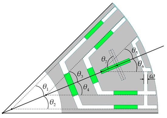 where θk is the flux barrier angle; θ7 is the deflection angle of the rotor’s single-pole-centered permanent magnet; ω is the width of the connected flux barrier; and C1 and C2 are the constraint functions for the average torque and torque ripple.