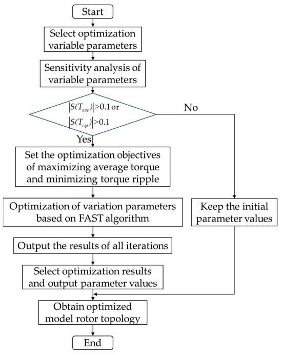 In order to obtain better torque performance for the proposed model in this paper, the average torque and torque ripple of the proposed model are optimized by changing the rotor topology of the proposed model. Figure 9 shows a parametric diagram of the single-pole topology of the proposed model rotor. Figure 10 shows the flowchart of multi-objective optimization. The optimization objectives of this multi-objective optimization are average torque and torque ripple. The definitions of average torque and torque ripple can be expressed by Equation (8).
