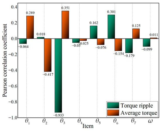 Using the Latin square sampling method, 100 sets of data were extracted for correlation analysis, and the results are shown in Figure 11. Variation parameters with absolute coefficient values of less than 0.1 will be removed in subsequent multi-objective optimization, and the original parameters will remain unchanged due to their low relevance to the optimization objective. From Figure 11, it can be seen that the absolute values of the correlation coefficients of θ4 and ω with the average torque and torque ripple are less than 0.1, which means that these parameters will remain constant.