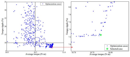 The FAST algorithm uses a self-initialization setting and limits the maximum number of iterations to 500. The optimized results are shown in Figure 12. In order to prevent the occurrence of excessive low average torque and excessive torque ripple, the frontier result in Figure 12 is selected as the optimized result through comprehensive consideration. The selection result is visible in the partially enlarged view of Figure 12. The dimensional parameters of the optimized model are shown in Table 3. Figure 13 shows the optimized model rotor single-pole topology of the model. The torques of the three models are shown in Figure 14. From Figure 14, it can be seen that the torque of the optimized model is the largest among the three models and has the least fluctuation. From Table 4, it can be seen that the optimized model improves the average torque by 25.32% and reduces the torque ripple by 76.92% compared to the conventional model. After multi-objective optimization, the torque performance of the optimized model is improved.