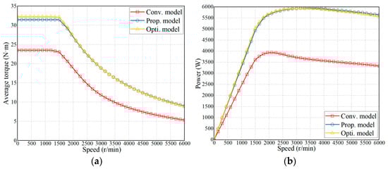 Comparison of the torque–speed and power–speed curves for the three models. (a) Torque–speed. (b) Power–speed.
