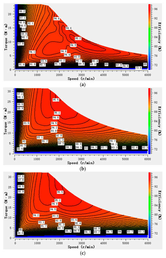 Speed–efficiency comparison of the three models. (a) Conventional model. (b) Proposed model. (c) Optimized model.