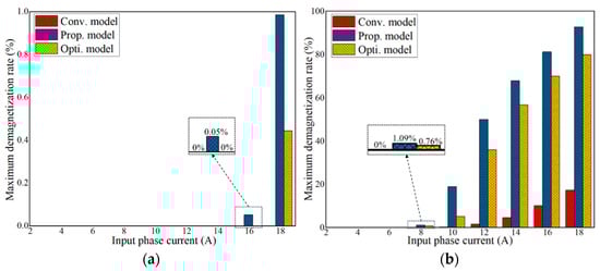 When the control temperature is 170 °C and 200 °C, the maximum controlled input current is nine times the rated current. The maximum demagnetization rates of the permanent magnets for the three models under different input current conditions are shown in Figure 17. Figure 17a compares the maximum demagnetization rate of the three models with different input currents at 170 °C. The maximum demagnetization rate of all three models is less than 1%, indicating minimal demagnetization. It is shown that the three models have good anti-demagnetization performance under extreme operating conditions. Figure 17b shows the comparison of the maximum demagnetization rate of the three models with different input currents at 200 °C. At four times the rated current, the permanent magnets of the proposed and optimized models start to demagnetize. Compared to the proposed model and the optimized model, the permanent magnet of the conventional model has a larger size and a stronger anti-demagnetization performance. In Table 6, it can be seen that the maximum demagnetization rate of the optimized model is reduced by 13.84% compared to the proposed model at a temperature of 200 °C and nine times the rated current operating condition. This indicates that the anti-demagnetization performance of the optimized model is improved compared to the proposed model. Figure 18 shows the demagnetization rate distributions of the three models at a temperature of 200 °C and an input current of nine times the rated current.
