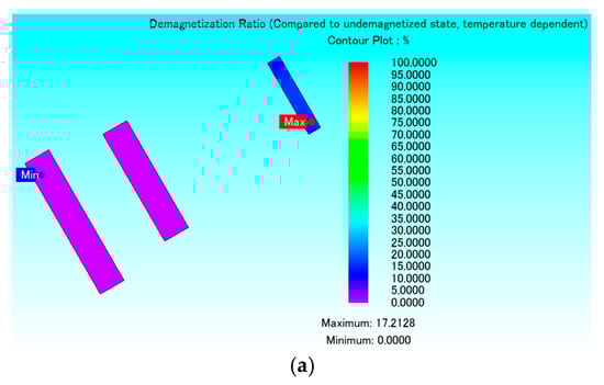 Permanent magnets with smaller size are usually more prone to demagnetization. Since the proposed and optimized models in this paper use multilayer and smaller-sized permanent magnets, it is necessary to analyze the anti-demagnetization performance of the three models. The demagnetization of permanent magnets is analyzed by examining the changes in remanence of permanent magnets before and after applying high input currents. The definition formula for demagnetization rate [] is shown in Equation (12).