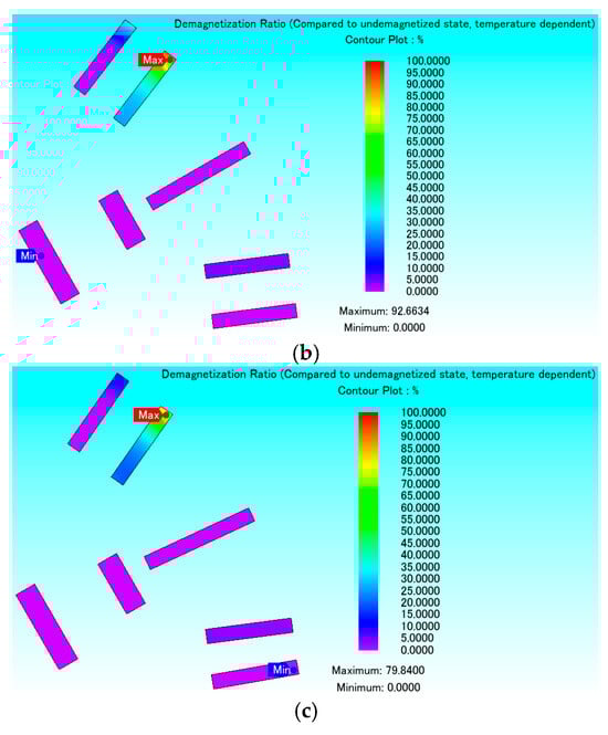 Demagnetization rate distribution plots for the three models at 200 °C and nine times the input current. (a) Conventional model. (b) Proposed model. (c) Optimized model.