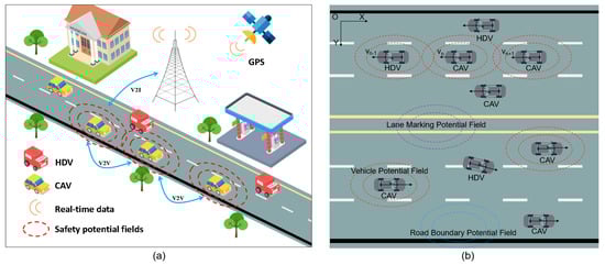 In mixed traffic environments featuring CAVs and human-driven vehicles (HDVs), CAVs can obtain extensive state information about the surrounding environment, including their own locations, lane lines, and information about surrounding vehicles. In these traffic scenarios, any element impacting a vehicle’s driving state can be considered a field source in the physical space. The safety potential field characterises driving safety in car-following scenarios based on the interaction forces of these elements. To analyse the amalgamation of vehicles, roads, and environmental elements in coupled scenarios in a layered manner, this study adopts an adaptive layered model for scenario representation, as per Menzel et al. []. Figure 1a,b illustrates a typical car-following scenario, comprising three key elements: lane-marking lines, road boundary lines, and vehicles. Consequently, in the traffic environment, CAVs are influenced by the potential fields of lane-marking lines, road boundary lines, and other vehicles, denoted as UL, US, and Uv, respectively. The safety potential field is calculated using (1).